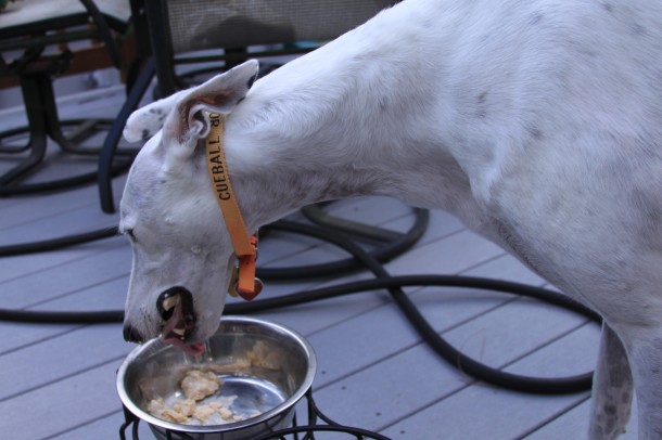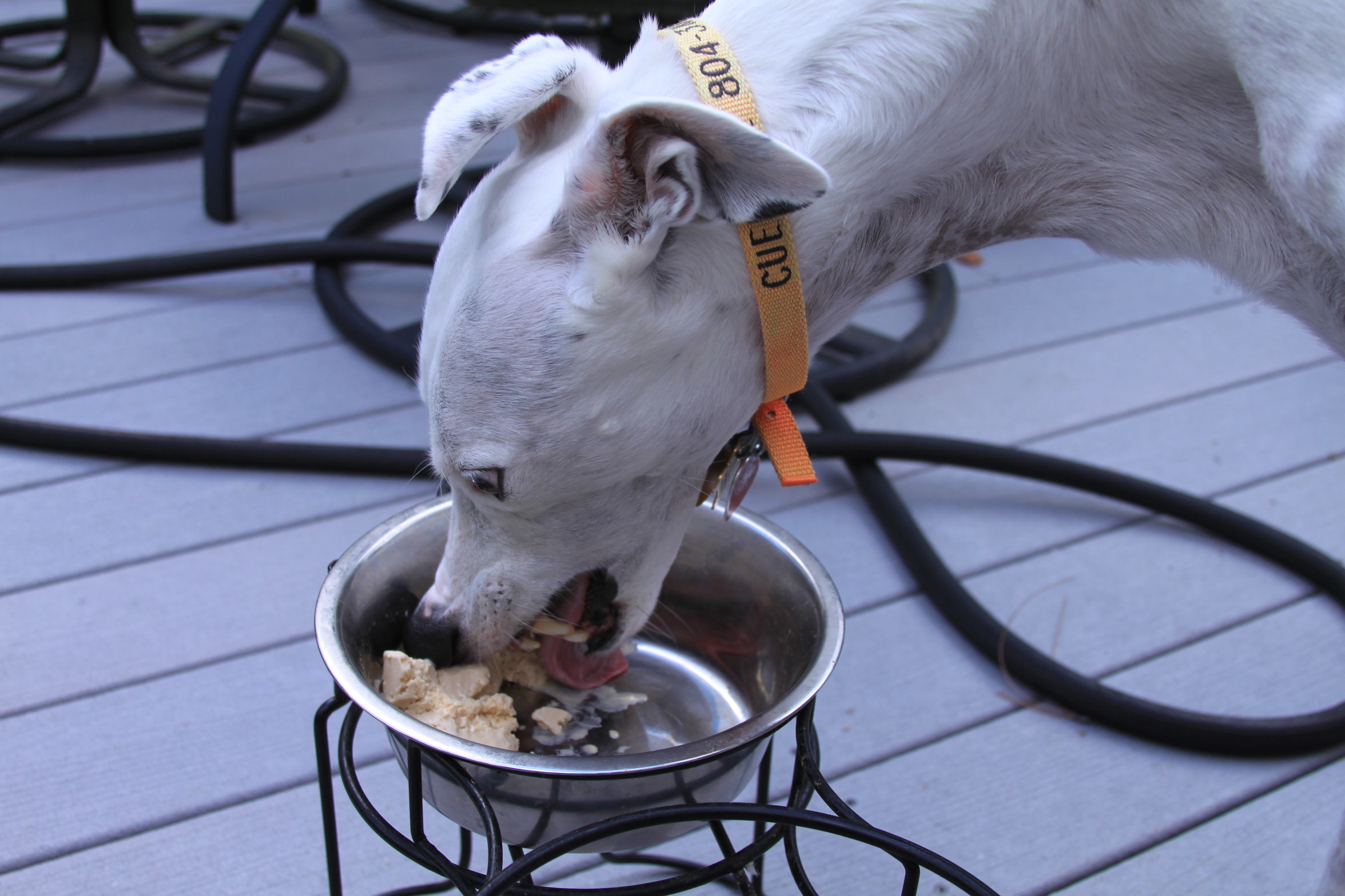 We repeated the frosty paws treats for Cueball’s birthday. The weather was a bit cooler in the afternoon, so we let the pups have their treat on the deck. At first they were quiet confused as to why their bowls and feeding stands were being taken outside, but soon figured out it was for good reason.