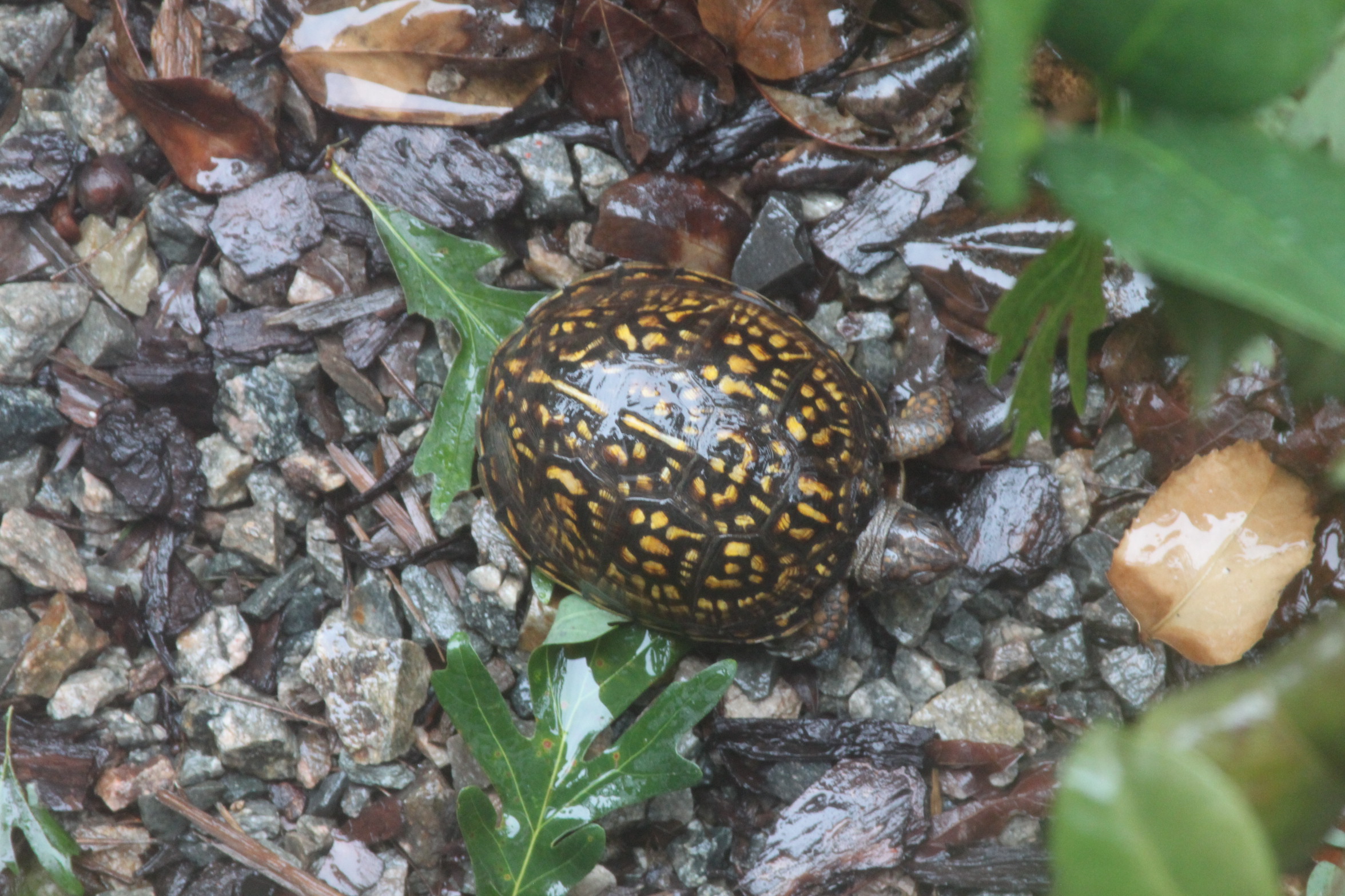 This was no big deal. Then I found this guy (below) by our front porch. Not sure where he came from. We have lived here 11 years and I cannot ever remember seeing any turtles in our yard. We took him to safer, higher ground to ride out the storm.