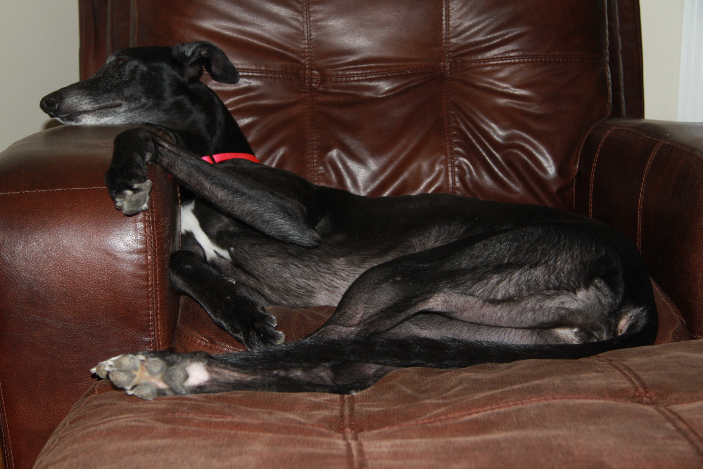 On Valentines Day, at lunch time while Mitch was providing our pups a day break, Ziva got out of our fenced yard and took off down the street.  The side gate by the carport was not secured.  Mitch realized this a few seconds too late.  Both her and Cueball got out.  He managed to call Cueball back to him at the end of our street.  Then he witnessed something that no one should ever see. Ziva was standing in the road when a Nissan SUV approached and hit her.  The impact sent her into a ditch.  The driver did brake but was unable to stop completely in time because of the icy roadway.  Ziva got up and took off.  Mitch called me panicking at work to let me know Ziva was missing.  He did not tell me she had just been hit by a car.  He did not want to get me worked up.  Mitch tracked her through the woods.  Luckily she was easy to track because of all the snow still on the ground.  Once she got to the roadway, he had no idea which way she went from there.  I rushed home and on my way home started getting the word out.  We are fortunate to have a very compassionate Greyhound Community in our area.  We had several people helping us look for her and spreading the word through FB, email and phone.  A good Samaritan found her wandering up to his second floor apartment which is located in the complex across a main road from our subdivision.  He was able to get a hold of her ID collar and thankfully called me.